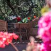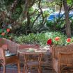 Una camera matrimoniale con accesso a un terrazzo privato dotato di doccia esterna e tavolino per colazioni o pranzi riservati