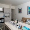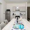 Un grande open space che unisce sala e cucina, creando un ambiente conviviale dove rilassarsi o cucinare in compagnia.