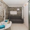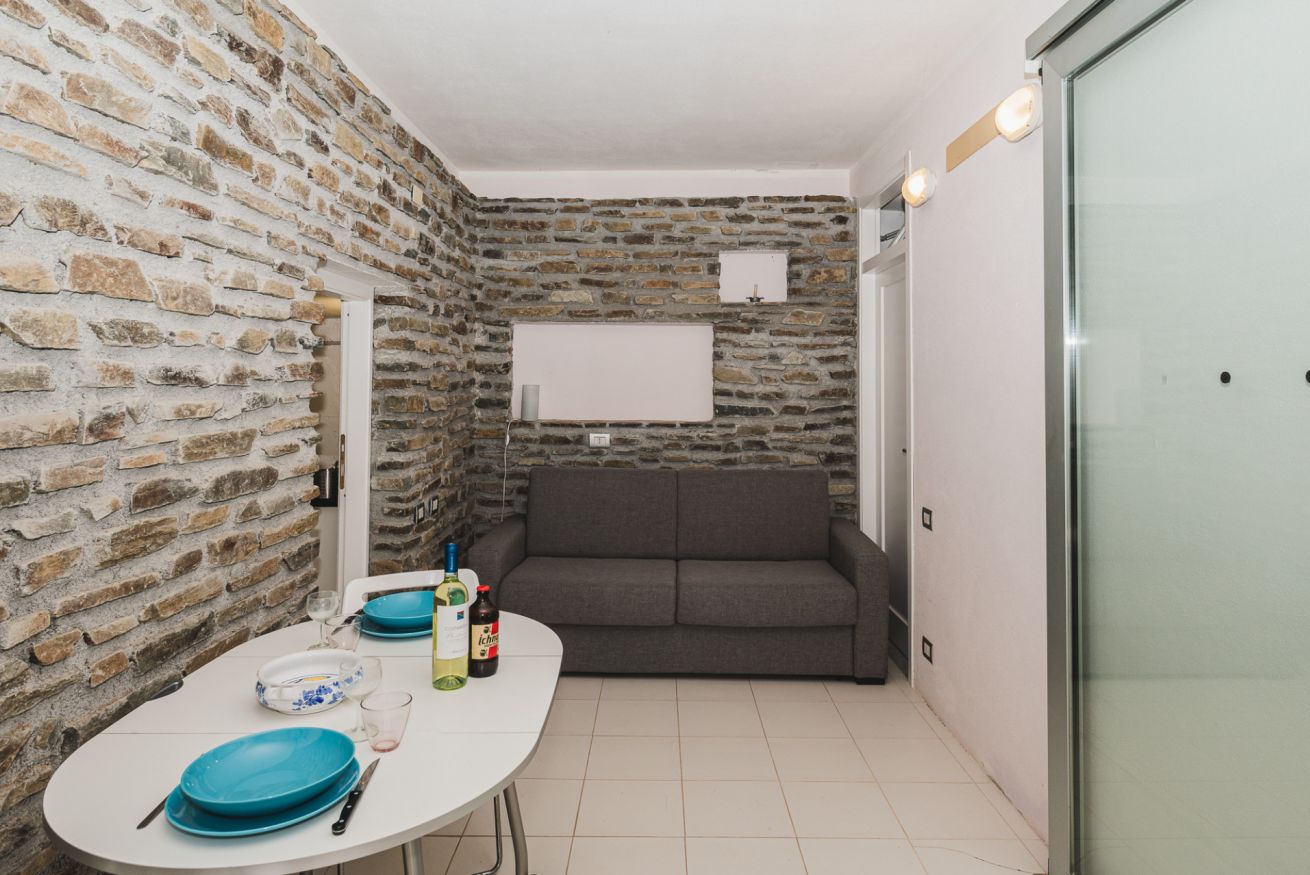 - Zona giorno distinta, con parete in pietra a vista che aggiunge personalità
