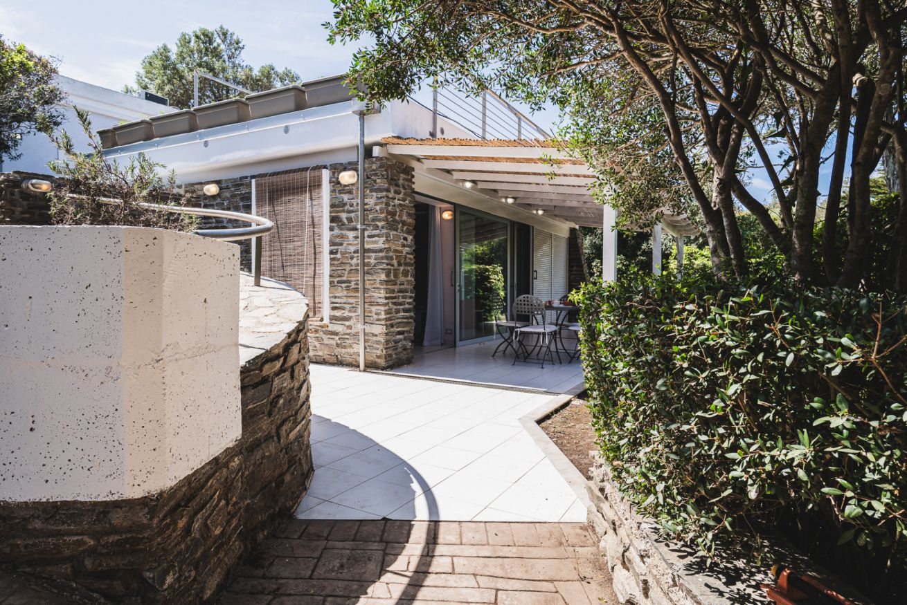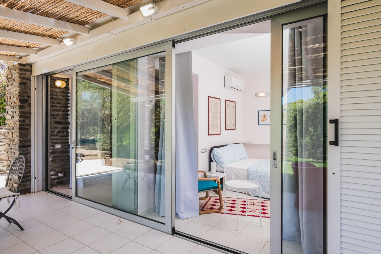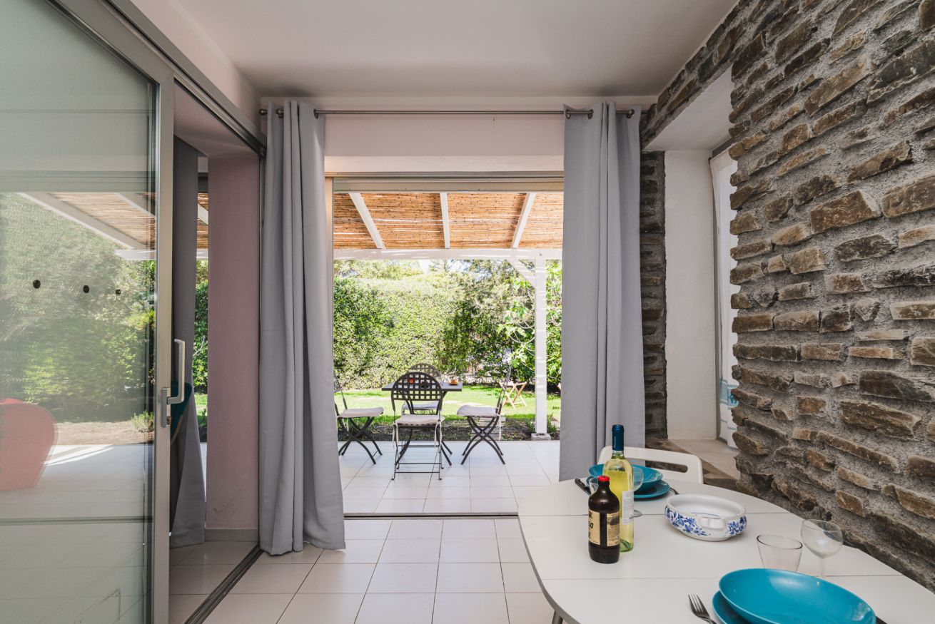 Qui la casa si apre davvero verso l’esterno: grandi vetrate, veranda coperta, giardino e una zona outdoor che rende più piacevole ogni rientro. In Via Molfino, in Località L’Ancora Stintino, si inserisce in un contesto tranquillo, ideale per chi cerca una vacanza più rilassata e ben vissuta. Gli interni hanno un’impronta semplice ma riconoscibile, con la parete in pietra a vista che dà carattere alla zona giorno e rompe l’effetto anonimo. È una soluzione che funziona bene per chi vuole quiete, spazi ben distribuiti e la comodità di vivere la casa anche fuori.